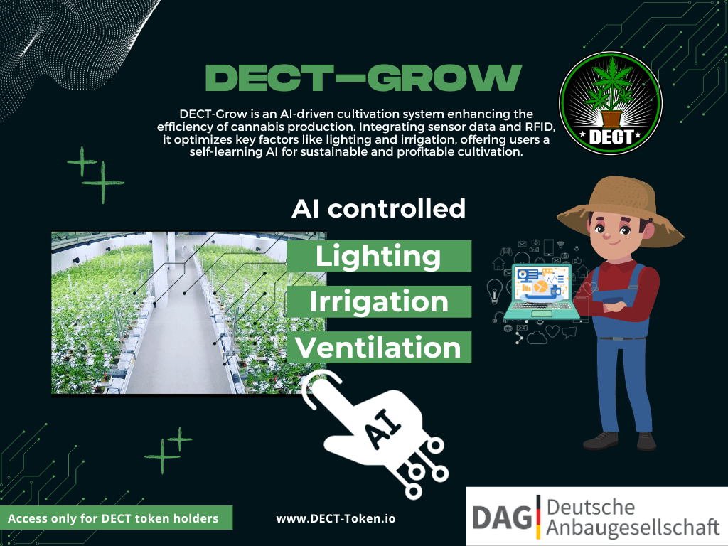 The “DECT-Grow” system is an innovative and AI-supported cultivation management solution that helps cannabis social clubs and cultivation companies to plan, manage and organize the cultivation of cannabis plants more efficiently. The system addresses various challenges in the cultivation process and offers a wide range of features to improve cultivation management. These include functions such as monitoring environmental conditions, automatic and AI-controlled lighting, irrigation, nutrient management and climate control, as well as disease and pest control and harvest time prediction.
